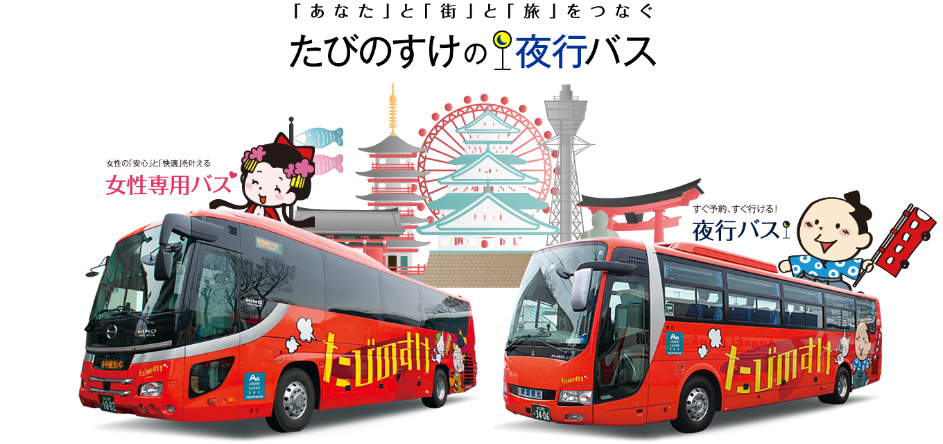 一人で夜行バスに乗るのは心配という女性のお客様へたびのすけバスでは女性専用車両を設けておりますので安心してバスの旅をお楽しみください。女性専用夜行バス「たびのす...